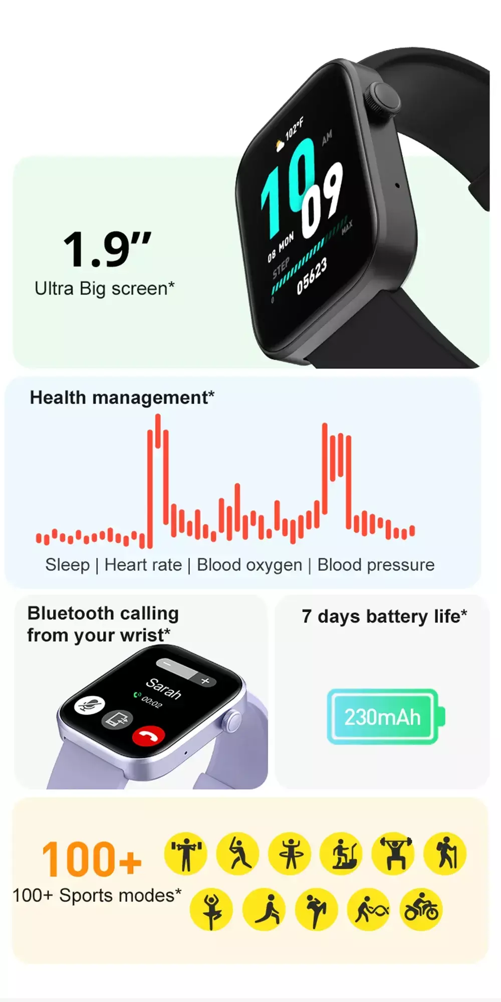 Registro de atividade (passos, calorias, distância), objetivo esportivo, 100 + modos de exercício, relatório de dados esportivos, IP68 à prova d'água.