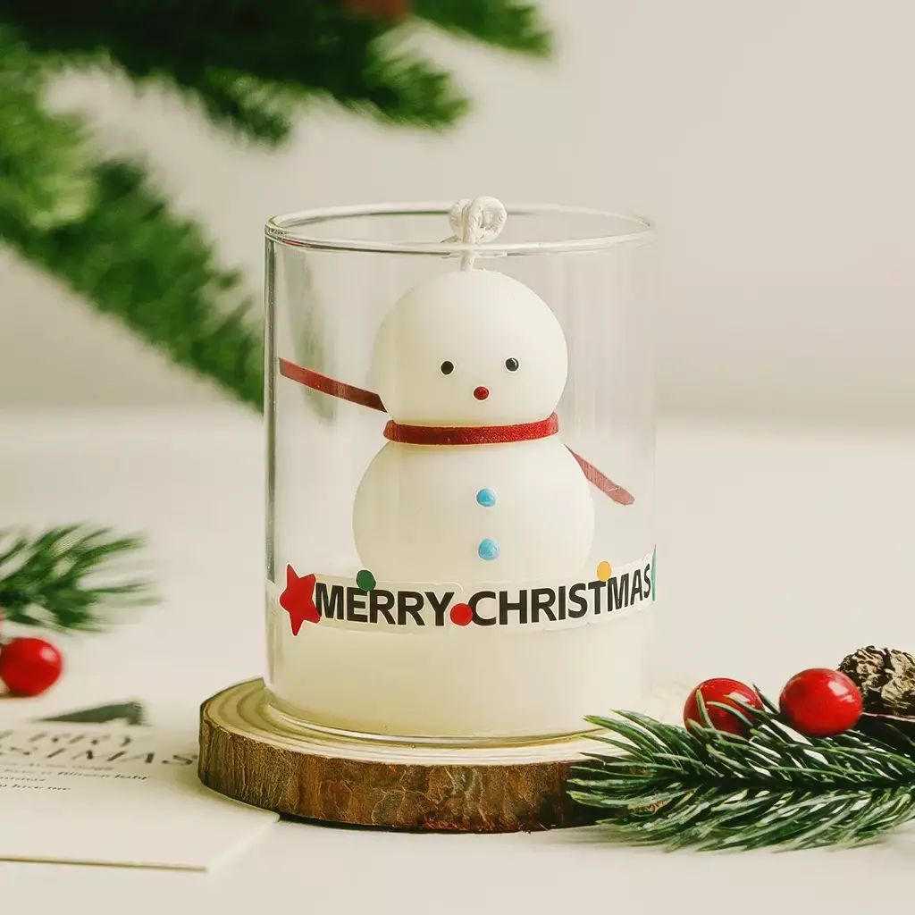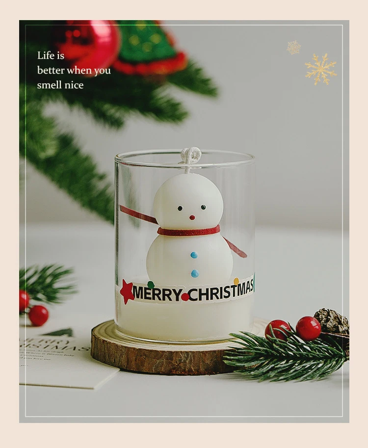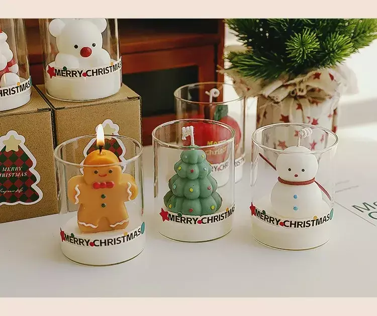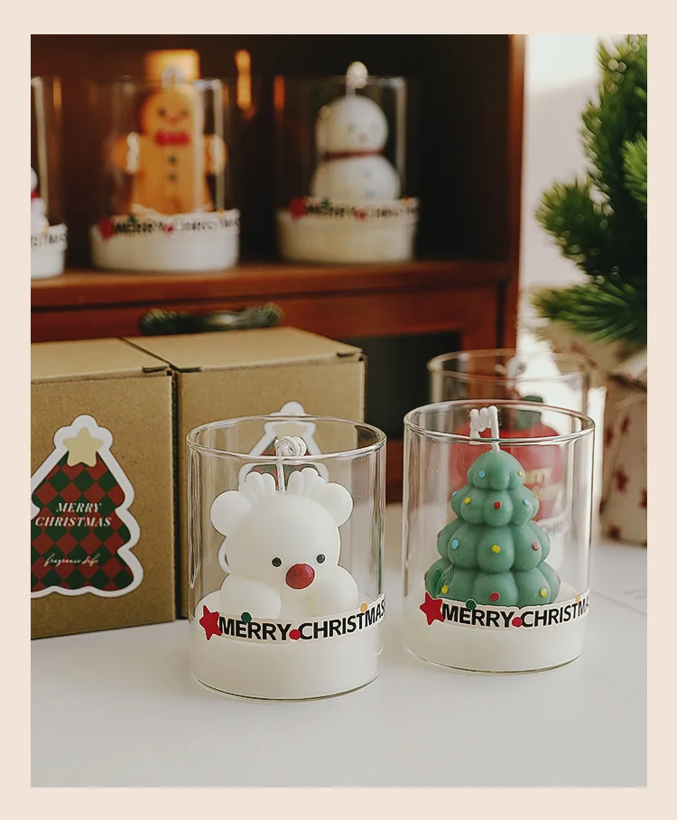 1?? Vela perfumada de Natal em copo de vidro – Vela de cera de soja feita à mão em um frasco de vidro transparente, com adoráveis formas com tema de Natal como Papai Noel, boneco de neve, árvore de Natal, renas e boneco de gengibre.